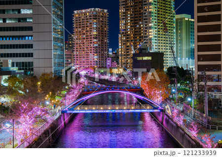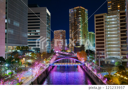 目黒川を彩る桜のイルミネーションとビル群の夜景