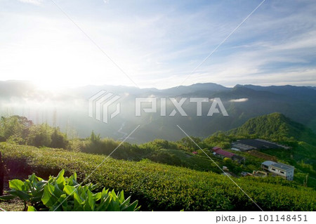 台湾 阿里山山脈と茶畑の朝の風景