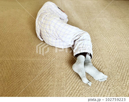 寝巻姿で寝転んだ、靴下を履いた足