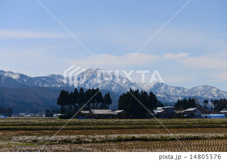 五泉市一本杉のチューリップと菅名岳