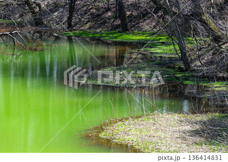 鮮やかな緑色の湖 五色沼の風景
