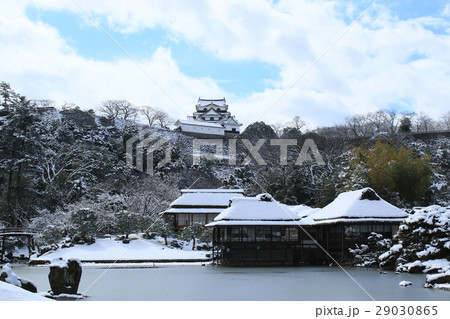 楽々園 彦根城 滋賀県 橋 木造家屋 雪景色