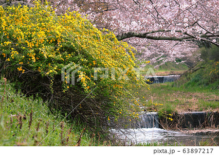京都府井手町 玉川堤 ヤマブキと桜の風景