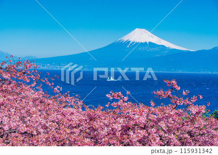 (静岡県)河津桜咲く、西伊豆井田から望む、富士山