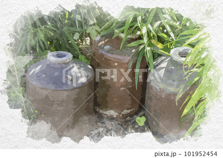 水彩画風 引田 讃州井筒屋敷 醤油甕 香川県東かがわ市
