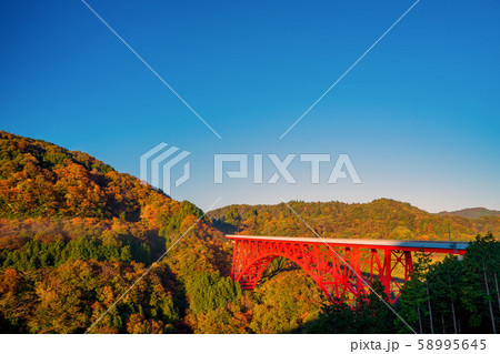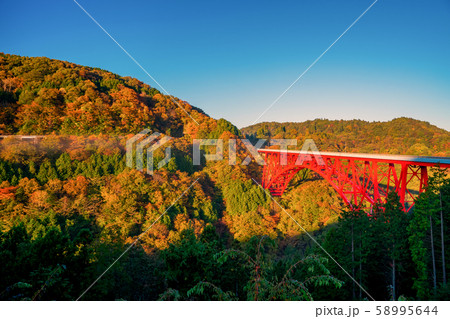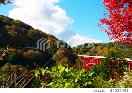 紅葉の奥出雲おろちループ三井野大橋と木次線三井野原駅へと向かう奥出雲おろち号 島根県仁多郡奥出雲町