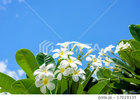 White plumeria with blue sky background