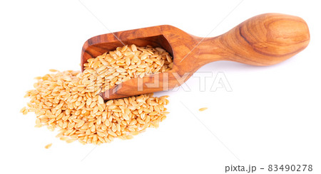 Golden flax seeds in wooden scoop, isolated on white background. Heap of dry flaxseed or linseed.