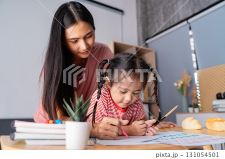 Supportive mother coaching daughter in art creativity and learning letters at home
