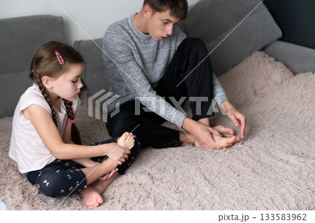 Sibling bonding during a cozy afternoon at home while stretching and relaxing together on a soft couch in a warm, inviting living room