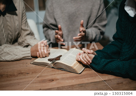 Group of Christians sit together and pray around a wooden table with blurred open Bible pages in their homeroom.