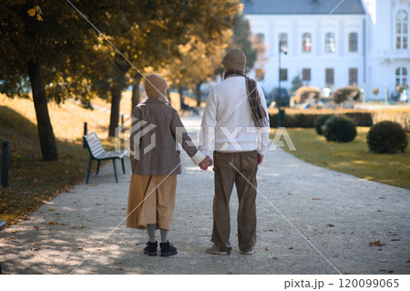 Rear view of beautiful senior couple during walk in autumn park. Elderly husband and wife holding hands during stroll.