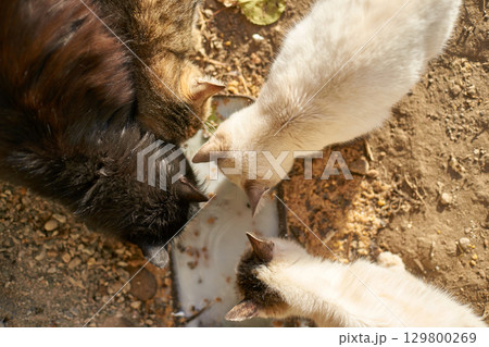 Four cats of various colors drinking milk from a bowl on dirt ground from above