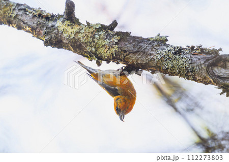 枝にぶら下がるイスカの雄