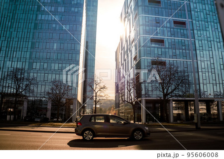 Sun goes through city skyscraper public transport scene in Gdansk. Oliva business district Transport city traffic. Trams buses cars City Traffic Jam