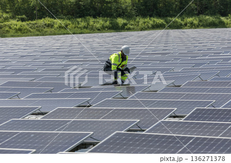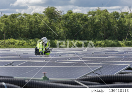 Engineer Checking and working setup Floating solar panels or solar cell Platform system on the lake.