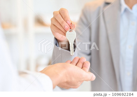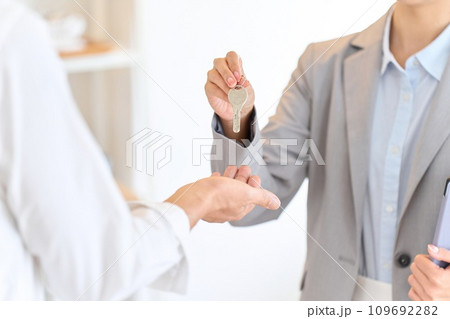 家の鍵を渡す不動産営業の女性