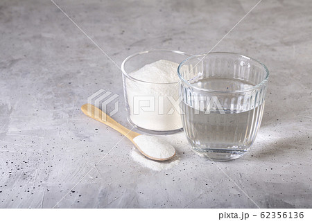 Collagen protein powder - Hydrolyzed. Spoon and glass of water.