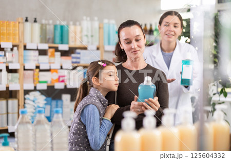 Woman with preteen daughter choosing oral rinse at pharmacy