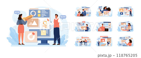 Marketing campaign set. Brand or product advertising with entertaining and engaging content. Character developing and following a content plan in social media and website. Flat vector illustration