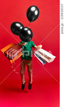 Child jumping with shopping bags and black balloons on red background