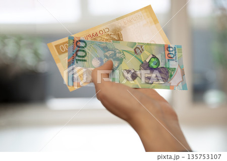 Woman holding 100 hundred new ruble banknote. Russian cash money as symbol of finance and payment. Macro shot of currency.