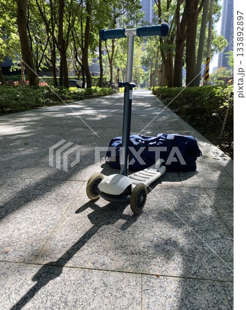 Kick Scooter on Empty City Sidewalk with Trees