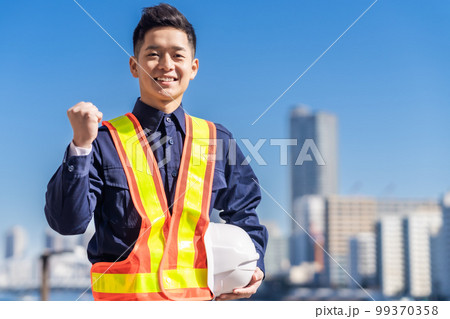 青空の下ヘルメットを持った若いガードマン