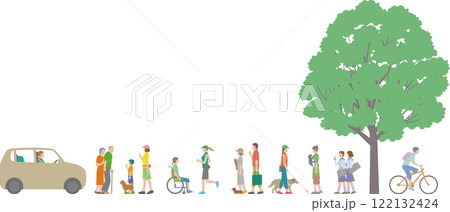 挨拶をしたりペットの散歩をする歩く人々の日常風景イラスト