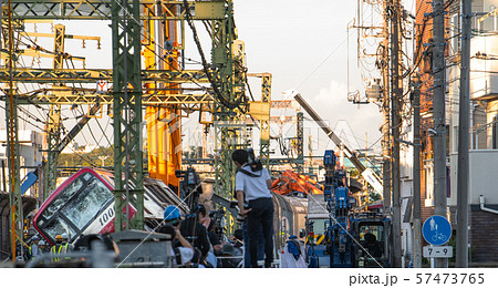 日本の横浜都市景観 京急線衝突事故現場。報道陣・見物客(敷地侵入・スマホ撮影男性)=6日午後撮影