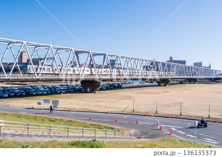 江戸川河川敷・京成江戸川橋梁と市川の街並み