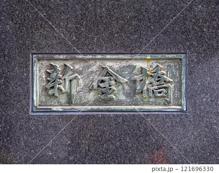 かつての楓川・築地川連絡運河に架かる「新金橋」の親柱と銘板(東京都中央区)