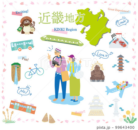 日本の近畿地方の春の名物観光を楽しむ観光客、アイコンのセット(線画)