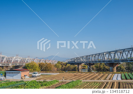 桂川に架かる東海道線鉄橋と河川敷に広がる野菜畑 京都市