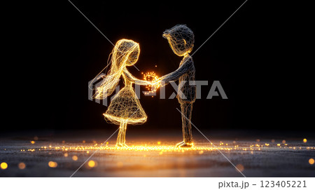Glowing wireframe figures of a man and woman holding hands, symbolizing love and connection, perfect for expressing the warm emotions of Valentine's Day