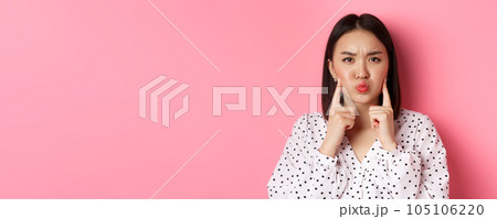Beauty and lifestyle concept. Cute asian woman making grumpy face, poking cheeks and grimacing, standing over pink background
