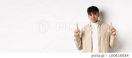Portrait of young male model in glasses looking suspicious and frowning, pointing fingers up with disbelief, standing on white background