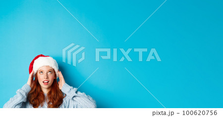 Winter holidays and Christmas eve concept. Head of cute redhead girl in santa hat, appear from bottom and looking up at copy space, staring logo, standing over blue background