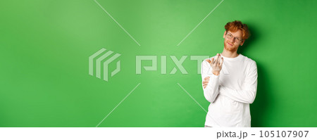 Young man with red messy hair and glasses, smiling pleased and pointing hand at camera, your turn gesture, standing over green background