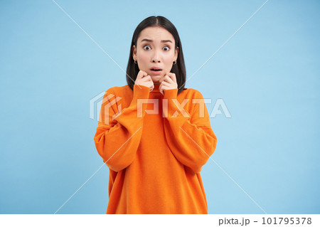 Korean woman with shocked, scared face expression, watches horror, looks terrified, startled by smth scary, stands over blue background