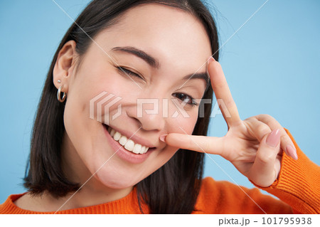 Close up portrait of positive asian woman, winks and shows peave, v-sign gesture, sticks tongue and smiles, stands over blue background