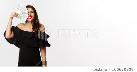 Fashion and shopping concept. Happy young woman in black dress, with red lips, holding money and smiling satisfied, standing over white background