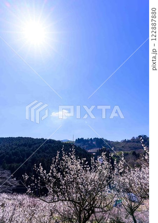 梅見月(うめみづき)の晴天に映える梅の花「人吉市の南、大畑(おこば)の丘の斜面にひろがる梅園」人吉市