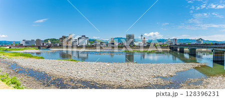青空を背景に球磨川沿いの温泉と川下りで有名な人吉市 都市景観パノラマ風景