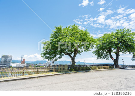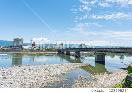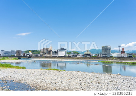青空を背景に球磨川沿いの温泉と川下りで有名な人吉市 都市景観風景