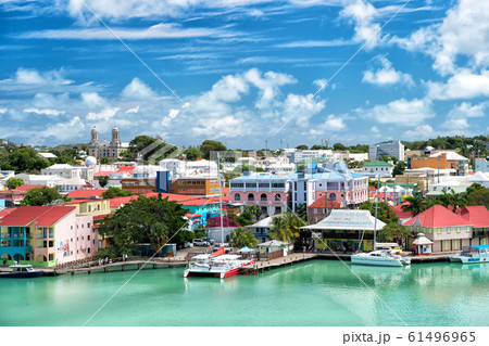 cute houses with yacht, boat at harbor, St. John,