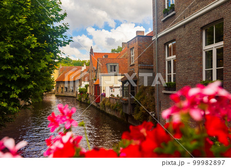 Summer landscape with views of houses and canals in the Brugge