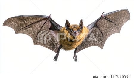 A flying bat with wide wings captured in mid-flight; showcasing unique features and colors