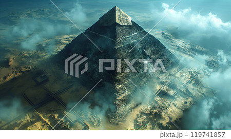 Aerial view of the Great Pyramid with surrounding desert landscape at sunset. Generative AI