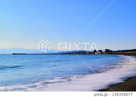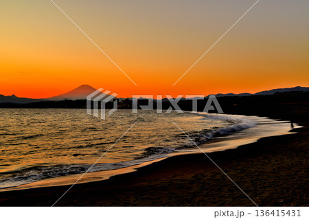 冬の茅ヶ崎海岸からの富士山の夕景 ブルーアワー